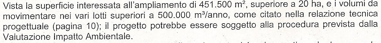 In quella mia richiesta - ancora senza risposta - avevo chiesto spiegazioni al Comune di Verona del perchè se avevono scritto questa frase (che tra l'altro è anche sbagliata) questa poi non era stata trascritta nella delibera.La frase esatta, anche in rapporto alla Legge Regionale Veneto n° 10/1999, avrebbe dovuto essere questa: "Visto la superficie interessata all'ampliamento di 451.500 mq. superiore ai 15 ettari, e i volumi da movimentare nei vari lotti superiori ai 350.000 mc/anno, il progetto DEVE essere soggetto alla procedura prevista dalla Valutazione Impatto Ambientale e pertanto la presente richiesta è illegittima".