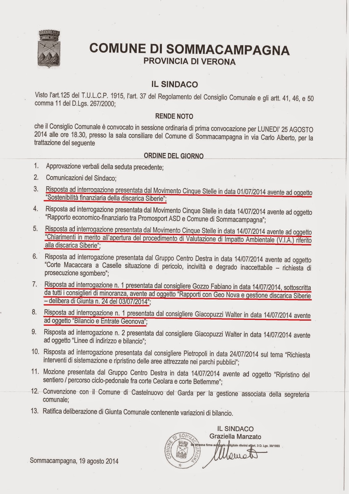 pubblicando l'Ordine del Giorno del Consiglio Comunale convocato per Lunedì 25
