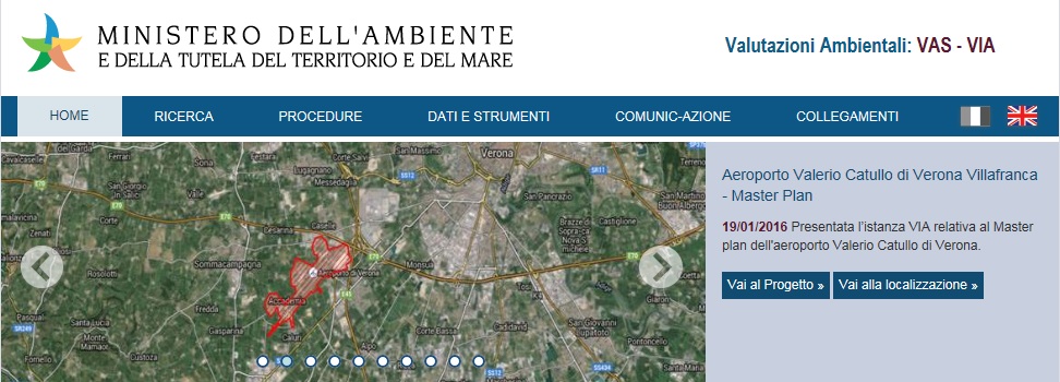 Sul sito web del Ministero dell'Ambiente nella sezione VALUTAZIONI AMBIENTALI VAS - VIA ora c'è anche questa immagine accompagnata da questo testo: "Aeroporto Valerio Catullo di Verona Villafranca - Master Plan - 19/01/2016 Presentata l’istanza VIA relativa al Master plan dell'aeroporto Valerio Catullo di Verona" e con questi due link: "Vai al Progetto »" - "Vai alla localizzazione »".