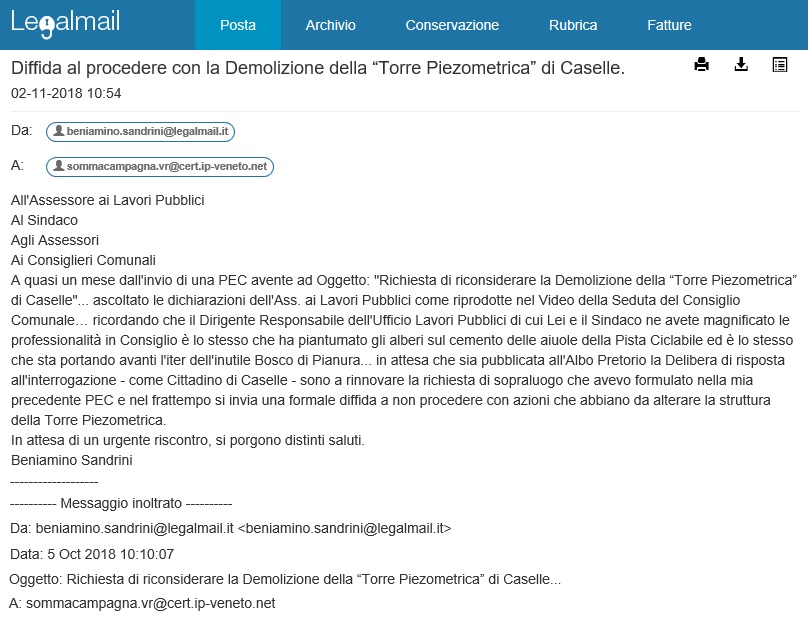 Oggi ho inviato una PEC avente ad oggetto: "Diffida al procedere con la Demolizione della “Torre Piezometrica” di Caselle".