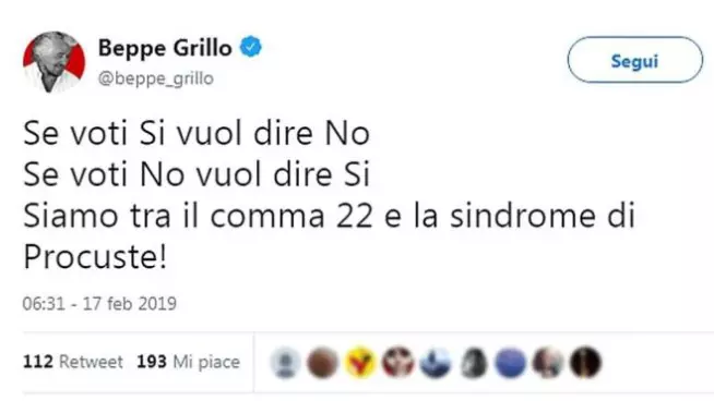 Da Quotidiano Net un articolo a titolo: "Comma 22 e sindrome di Procuste, ecco cosa vuole dire Grillo", con questo sotto titolo: "Il comico sarcastico sul voto online che deciderà la posizione del Movimento 5 Stelle su Salvini e il caso Diciotti. Ecco il significato delle espressioni che ha usato a proposito del quesito".